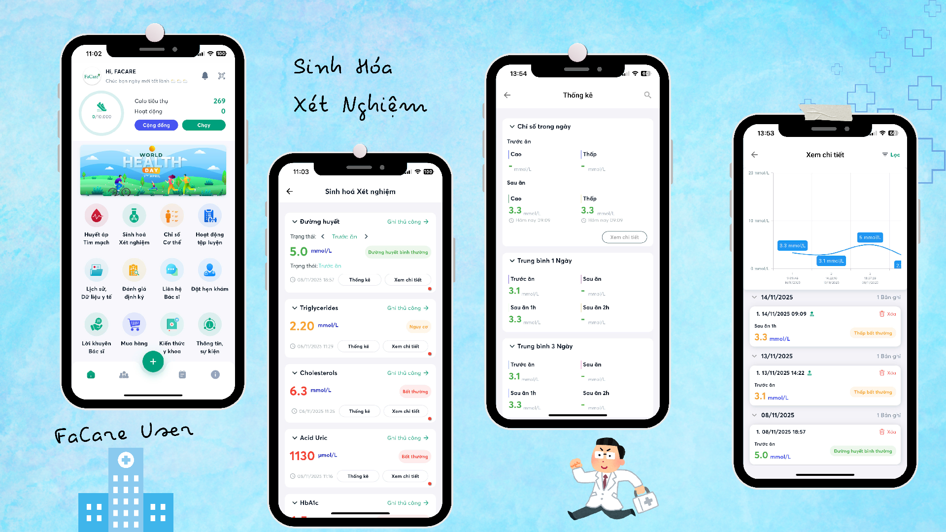 Việc hiểu rõ cơ thể mình là bước đầu tiên để phòng ngừa bệnh tật và duy trì sức khỏe lâu dài. Với sự phát triển của công nghệ, giờ đây bạn có thể theo dõi các chỉ số quan trọng của bản thân ngay tại nhà thông qua App FaCare, từ huyết áp, tim mạch đến các chỉ số sinh hóa xét nghiệm liên quan đến tiểu đường, mỡ máu và acid uric – những yếu tố quan trọng quyết định sức khỏe tổng thể.