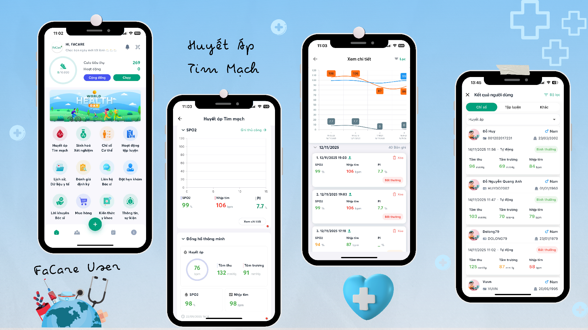 App FaCare giúp người dùng đo lường, lưu trữ và phân tích dữ liệu sức khỏe cá nhân từ các thiết bị y tế kết nối Bluetooth, bao gồm: